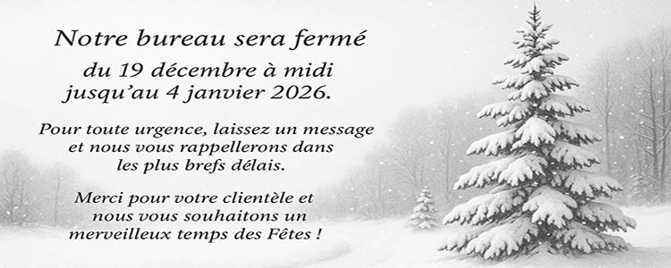 du 19 décembre à midi jusqu’au 4 janvier 2026. Pour toute urgence, laissez un message et nous vous rapellerons dans les plus brefs délais.