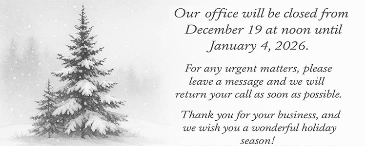 Our office will be closed from December 19 at noon until January 4, 2026. For any urgent matters, please leave a message and we will return your call as soon as possible.